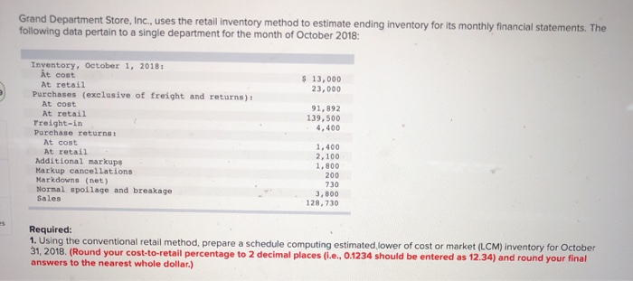 Solved Grand Department Store Inc Uses The Retail Inventory Me Chegg Com