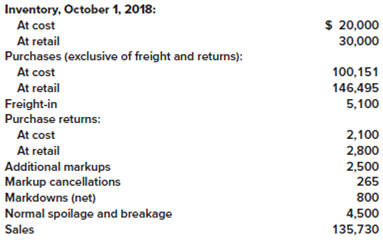 The following data pertain to a single department for the month of October 2018. Purchases for the period amounted to 390000 and were. The following data pertain to a single department for the month of October 2013 Inventory October 1 2013.